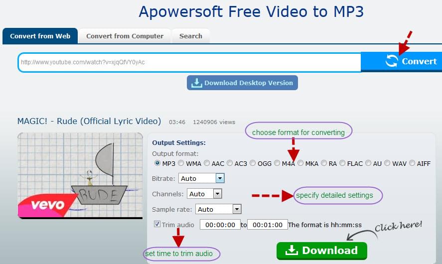 Providing that you hope to find an app that works like ListentoYouTube – get MP3 from streaming videos by converting URL, then Apowersoft free video to MP3 surely will satisfied you. The usage of this tool is quite straightforward, all you need to do is enter video URL to link address field, hit “Convert” icon, select output format and target directory for placing the audio. Later, you can open the local folder to find the downloaded MP3 and open it to check the audio quality. Please rest assured that the MP3 has standard high quality.