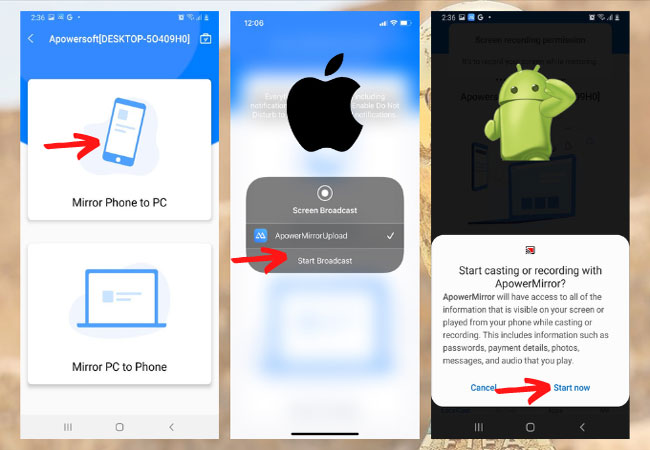 - Tap the Mirror Phone to PC option. For iOS, hit Start Broadcast and Start Now for Android devices.