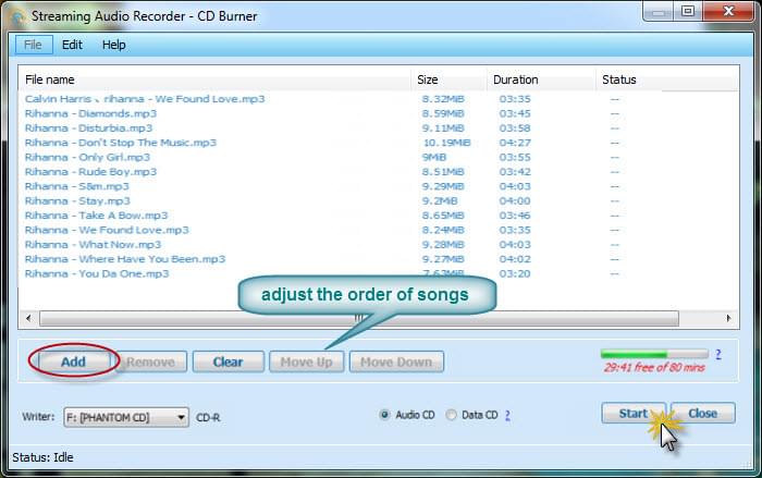 • After you have adjust the playlists, choose burn to “Audio CD” or “Data CD” according to your need. Press “Start” button and wait for the CD burning process gets done.