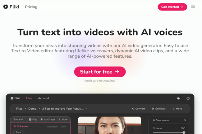 Fliki is a helpful tool for making videos easily. Simply enter text or prompts, and it turns them into videos or makes them talk in different voices. It simulates having assistance with scriptwriting and finds pictures and videos for you. With Fliki, you can make videos with voices that sound real in just a few minutes, which saves time. Aside from that, you can also find lots of pictures, videos, and music in its library. Moreover, if you speak different languages, you can use those languages too. Not to mention, this AI video maker free online program offers different voices to choose from and lets you use your voice in the video.