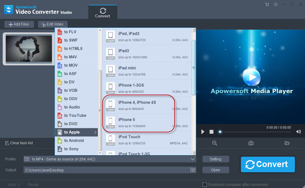 - Navigate to “Profile” field in the bottom and click to expand the profile list, and then choose “to Apple”, and select “iPhone” as the output format.