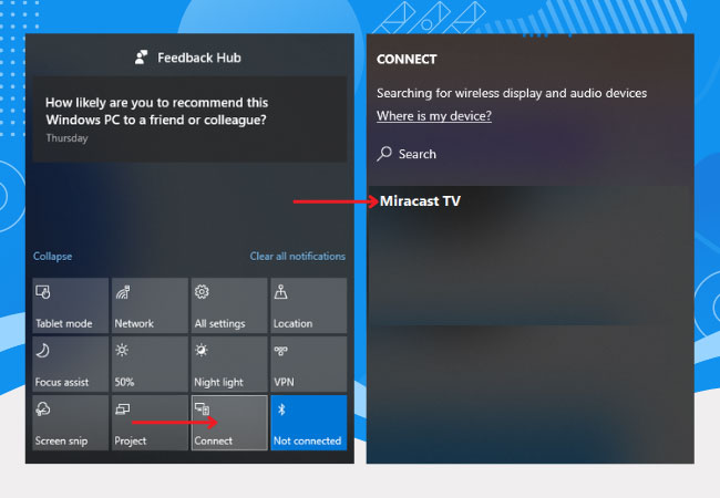 - On your Windows 11, go to the Notification panel on the right side of the screen, and click Connect to project your PC screen to your TV.