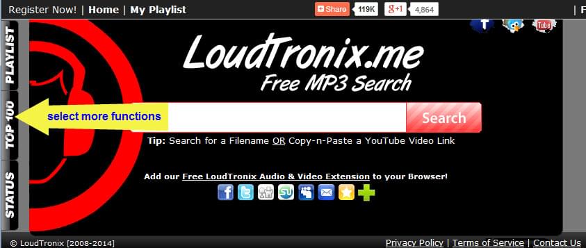 Loudtronix.me is a free Mp3 downloader which lets you search, download, share and play songs. Except of finding your desired songs by searching keywords, you are also allowed to rip background music, soundtrack or other audio source from YouTube via URL. Better still, registered users can enjoy more benefits. It is easy to collect your favorite songs, hit plus-shaped icon to add them to the playlist for listening on the site directly. Yet, this app is not stable enough at times, then you can check other sites like Loudtronix.