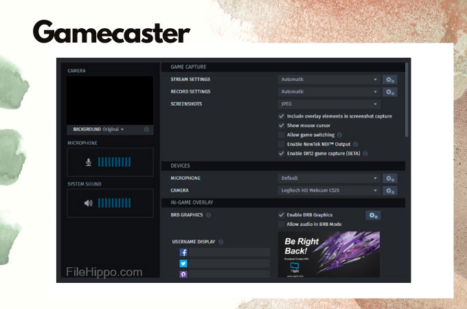 - Supports camera and offers custom overlays to help you personalize your livestream.
