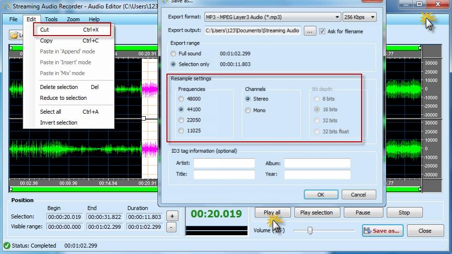 - Play the audio, then select the useless parts and silent parts. Click “Edit” – “Cut” to remove them.