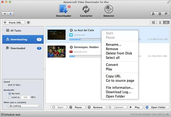 Once the application is preset, an automatic shutdown will be triggered when the task is complete. You also have the option to put the program to sleep or quit after downloading. In this case, you don't have to force yourself to sit in front of computer all the time. Besides, the Mac video downloader lets you organize the downloaded files in the library, it's your choice to rename, delete or play the video as you please.