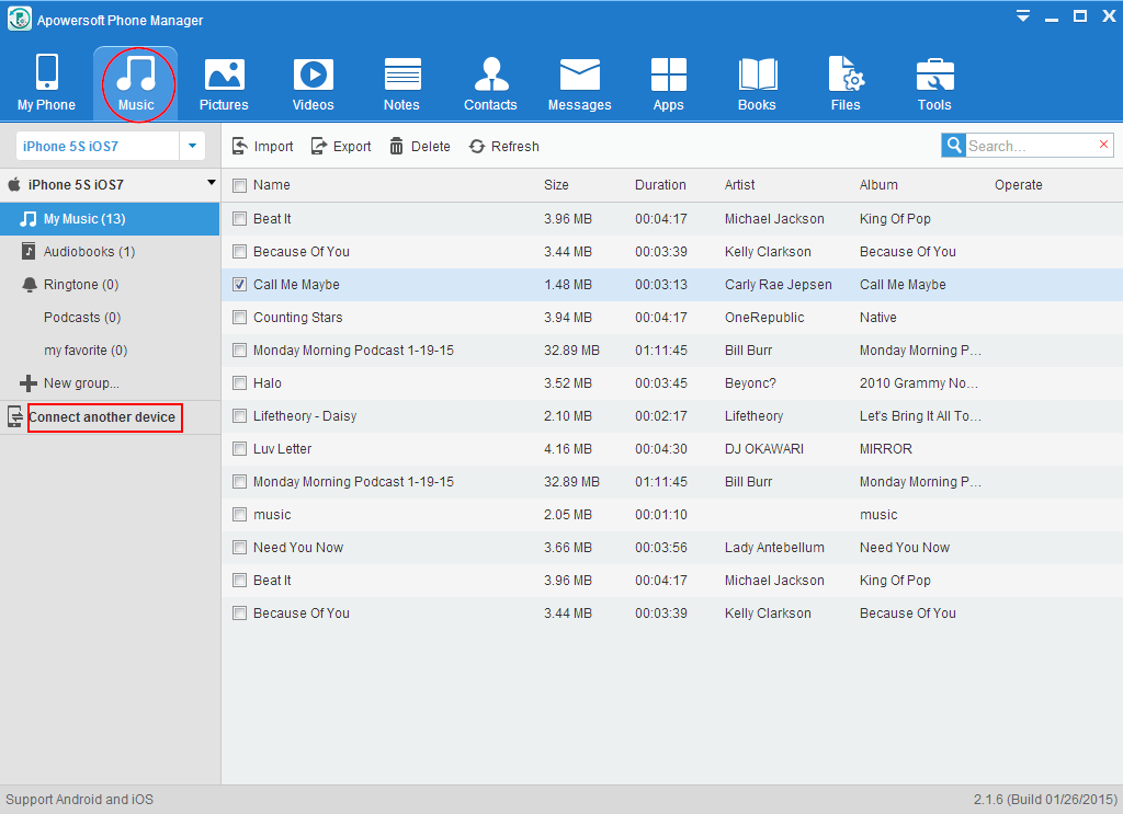 This phone manager is perfectly compatible with Android and iOS smartphones. If the wanted music is stored on other iDevices or Android smartphones, you can quickly transfer music between two devices, because this phone manager could simultaneously connect two phones and manage to transfer data between phone and computer.
