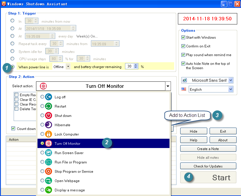 What makes the Windows Shutdown Assistant wonderful is that using it to switch off laptop monitor is very easy. In fact, even beginners wouldn’t find it hard to set tasks. Just download and install the program on your laptop, then follow the instructions below.