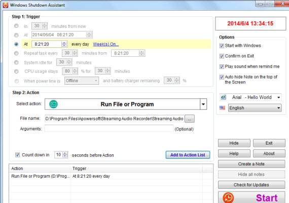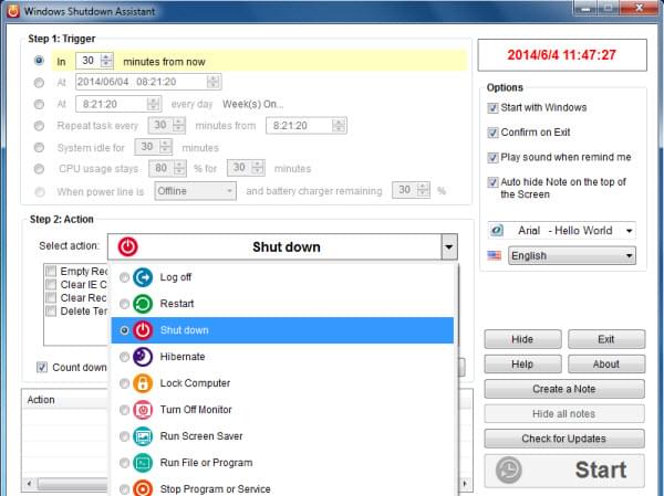 Windows Shutdown Assistant enables you to turn off Windows automatically in various modes. You are allowed to set the time to turn off the computer. Or, just configure settings to let computer shutdown when it's power off, over heat, or idle over a period of time. It only requires two steps to do so - set the "Trigger" and "Events", then let the program do the rest for you.